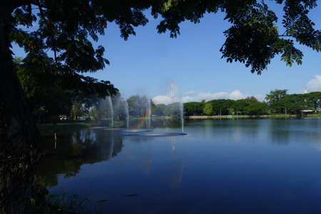 Rainbow reflection in the pond. This shot is taken in a public park in Bangkok, Thailand