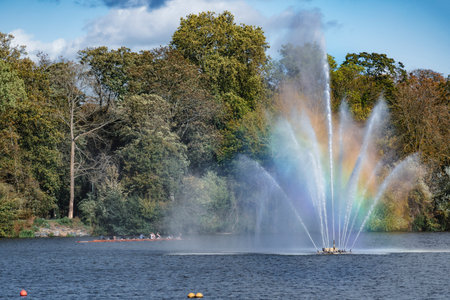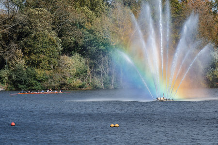 Fountain and rainbow in Riga Canal, Bastejkalns, Latvia