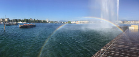 Geneva, Switzerland - July 30, 2018: A rainbow and water jet over the Lake of Geneva