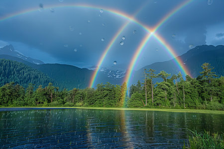 Digital image of double rainbow over the forest and mountains of british columbia, canada. a photo with an elegant style, taken