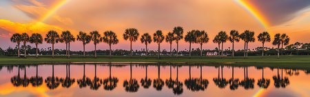 Sunset view of beach with palm trees and rainbow