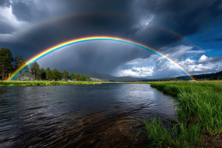 A vibrant rainbow stretches over a calm river as dark clouds loom in the background, illuminating nature's beauty.