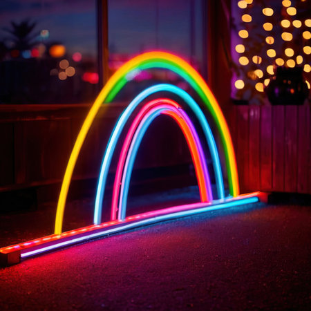 A vibrant neon rainbow design illuminating a wall with colorful lights, creating a joyful atmosphere perfect for modern decor and artistic inspiration.