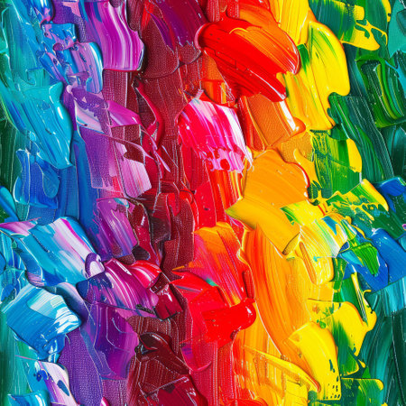 Close-up of a textured abstract painting depicting the colors of the LGBT Pride flag.