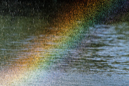 Defocused drops of falling rain and small rainbow on abstract dark background.