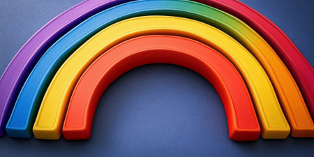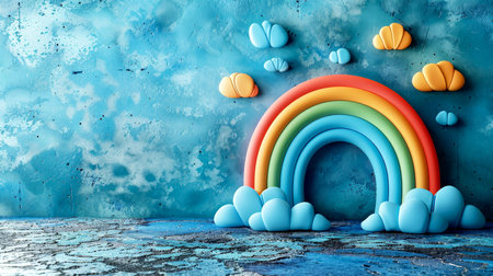 A vibrant rainbow arch made of soft materials sits against a blue textured wall, with fluffy clouds adorning the scene. Copy space.