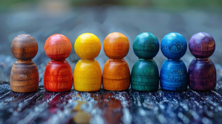 A vibrant display of toy figures in a perfectly organized lineup, each in a different color, symbolizing the harmonious balance between unity and diversity, ideal for promoting teamwork and equality
