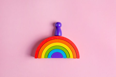 Colorful Waldorf wooden human figure rainbow in a montessori teaching pedagogy on pink background, kid play concept