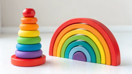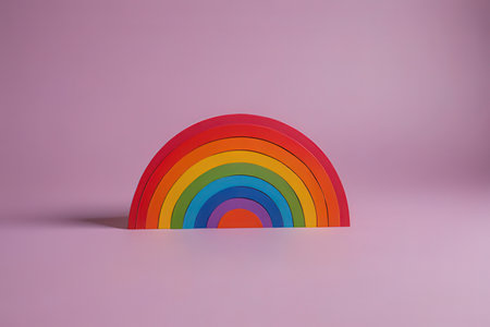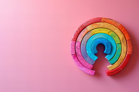 A simple rainbow wooden toy on a pastel pink background in a flat lay, minimalist style, with high resolution photography and a detailed, realistic ing of the rainbow shape with a colorful wood grain texture illuminated by a natural light source from the top left corner in a product shot with a cent