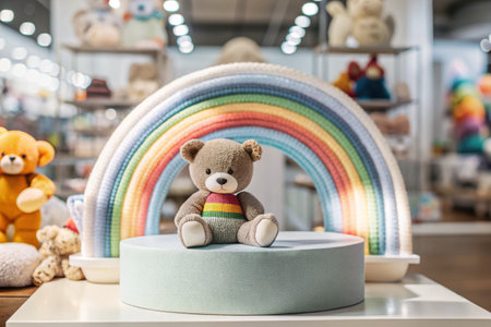 Beautiful colorful showcase of a children's store with a rainbow and a teddy bear. The concept of shopping and shopping for children's goods.