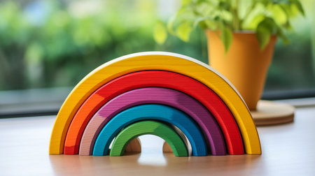 Wooden rainbow toy on background of window in nursery at home. Children background.