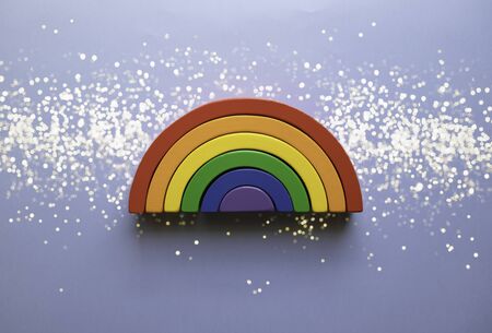 Wooden toy rainbow blocks with bokeh glitter on a blue background - creative LGBTQi concept flat lay