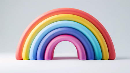 A vibrant rainbow arch made of pastel-colored layers stands between fluffy white clouds on a soft blue backdrop. This playful display enhances a cheerful atmosphere perfect for children..