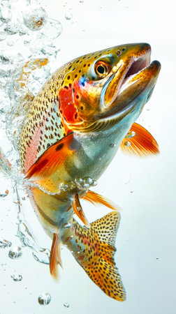 Vibrant Rainbow Trout Leaping Out Water Dynamic Wildlife Action Shot