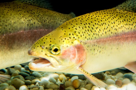 Photo of spotted rainbow trout swimming in stream