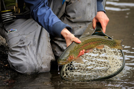 A beautiful view of an angler holding a cute Rainbow trout