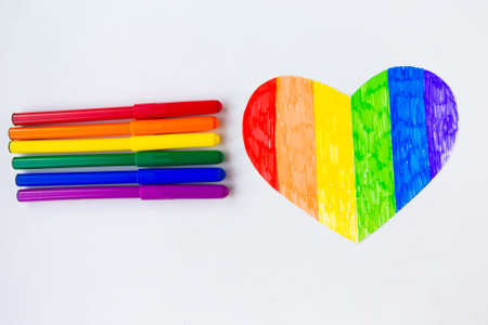 Pencils in lgbtq colors and heart on white background, top view