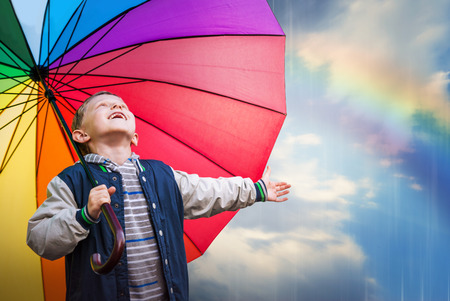Raindrops fall from the sky onto a rainbow-colored umbrella. Light rain. Cloudy weather.
