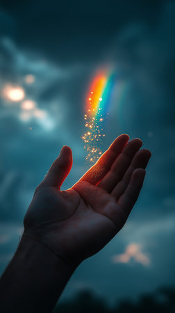 Hand of a man holding a glowing rainbow in the night sky.