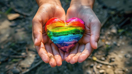 Two hands cradle a heart painted with the colors of the rainbow, representing love and LGBTQ solidarity