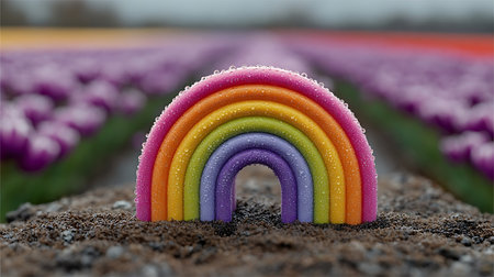 A close-up of a colorful rainbow sculpture covered in water droplets. The rainbow is set against a blurred background of a field of purple tulips. The foreground shows dark soil. The image has a soft, natural light and a cheerful mood.