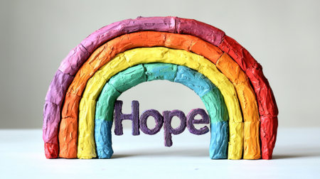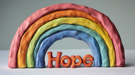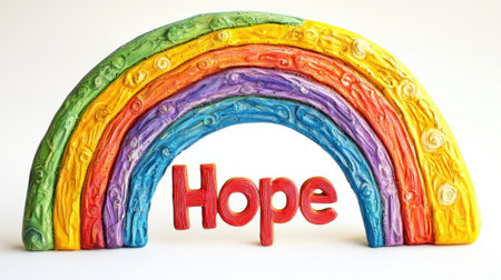 A rainbow made of clay with the word hope written on it. The rainbow is vibrant and the word hope is written in gold, conveying a sense of positivity and optimism