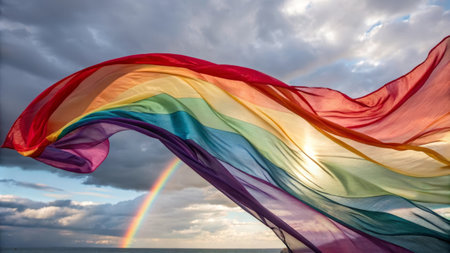 Vibrant rainbow flag waving against dramatic sky and rainbow.