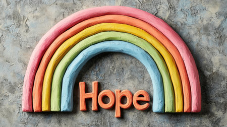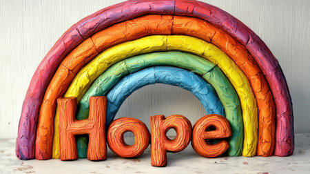 A rainbow made of clay with the word hope written in orange letters. The rainbow is colorful and the letters are bold and bright. Concept of positivity and optimism