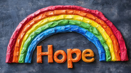 A vibrant rainbow crafted from colorful materials alongside the word Hope evokes feelings of inspiration and positivity. Ideal for uplifting themes and creative projects.