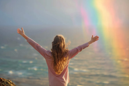 A rainbow is shining from a persons hand in the sun, AI