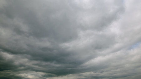 A captivating view of thick, dramatic clouds in shades of grey fills the sky, creating a moody atmosphere perfect for artistic, creative projects or backgrounds.