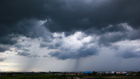 Dark storm clouds make the sky in black. The rain is coming soon. Beautiful heaven with dramatic light, sometimes heavy clouds mass charged. Abstract nature background.