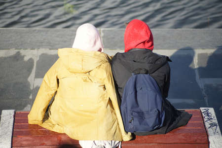 Full color horizontal photo. Two young people are relaxing in a park on the shore. Sitting on a bench. rear view.