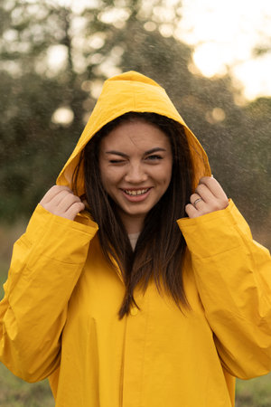 Young woman wearing yellow raincoat during the rain in the park enjoying the rain outdoors.