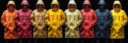 Brightly colored rain jackets and umbrellas are arranged creatively on a vibrant background, showcasing stylish options for rainy weather in a cheerful, modern way.