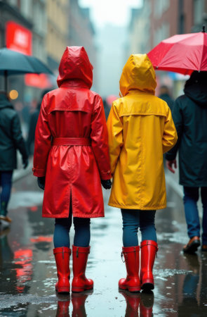 Two women wearing colorful raincoats and red rubber boots are walking down a rainy city street, holding hands and enjoying a wet stroll on a cloudy day