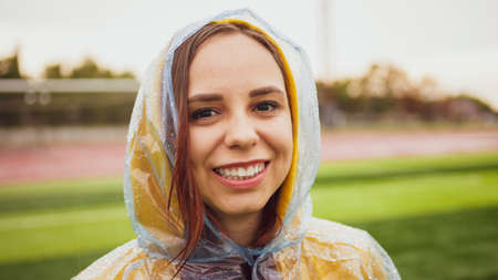 Young woman in raincoat in rainy weather. Portrait of positive female in wet waterproof coat