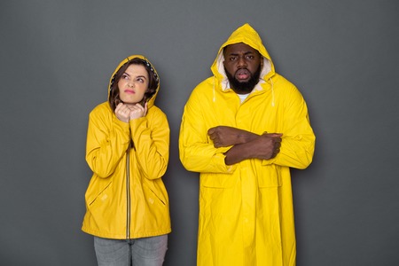 Half length of young interracial couple wearing yellow raincoats against gray background