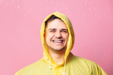 Heavy rain during autumn day. Portrait of young man in waterproof jacket.