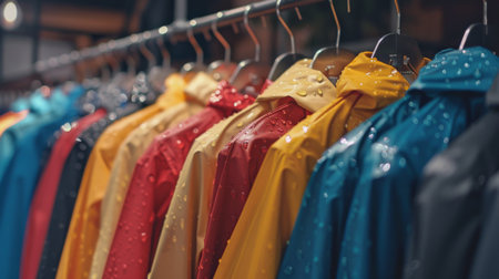 Collection of Colorful Raincoats Displayed on Hangers With Raindrops Glistening Under Soft Lighting in a Retail Store. Generative AI