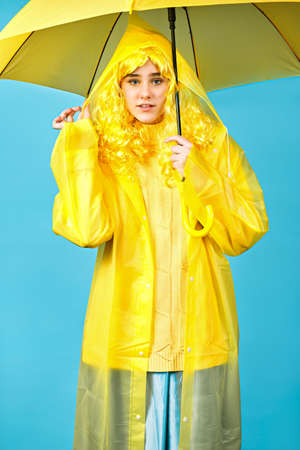 pretty teen girl in a yellow raincoat with an umbrella and a hood on her head. blue background