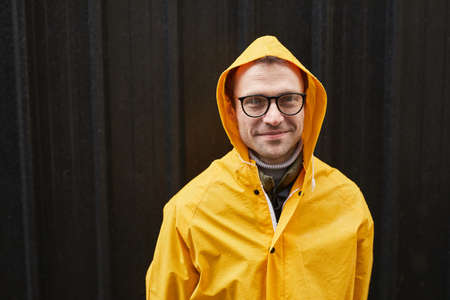 Horizontal medium close-up shot of Caucasian man wearing yellow raincoat standing outdoors on rainy day looking at camera