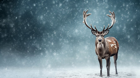 Majestic deer standing elegantly in a snowy forest during winter, surrounded by softly falling snowflakes