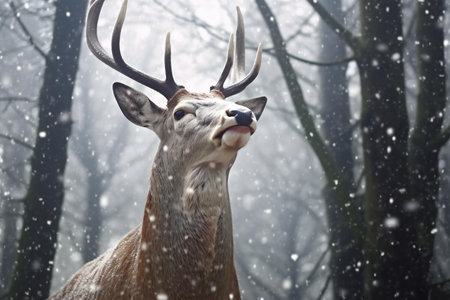 Majestic deer stands proudly in snowy forest during winter snowfall under soft, diffused light