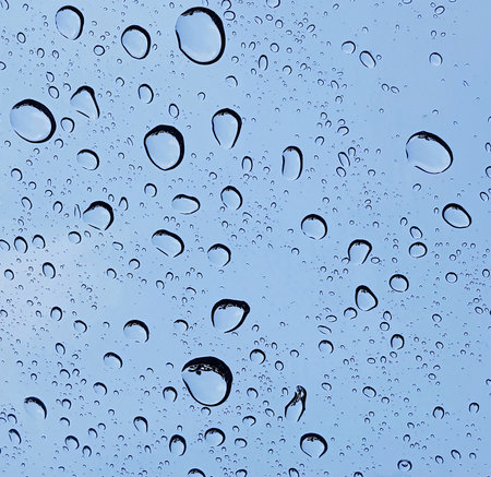 Rain and water droplets perspective through window glass surface against blue sky good for multimedia background content creation