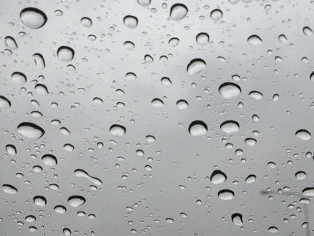 Macro pure rain drops on the glass against a cloud gray background