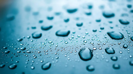 Water drops on blue metallic surface. Abstract background. Shallow depth of field.