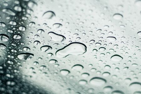 Raindrops on window. Wet glass blue tone background. Fresh water droplets.