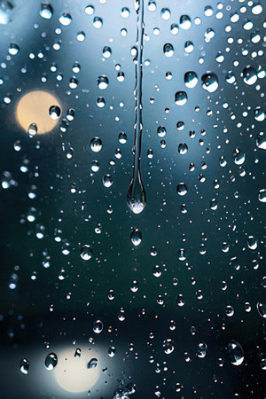 Raindrops on a glass window with a blurred background, capturing a tranquil and soothing mood.