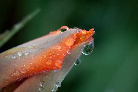 Raindrops on the petals of an orange and pink tulip
